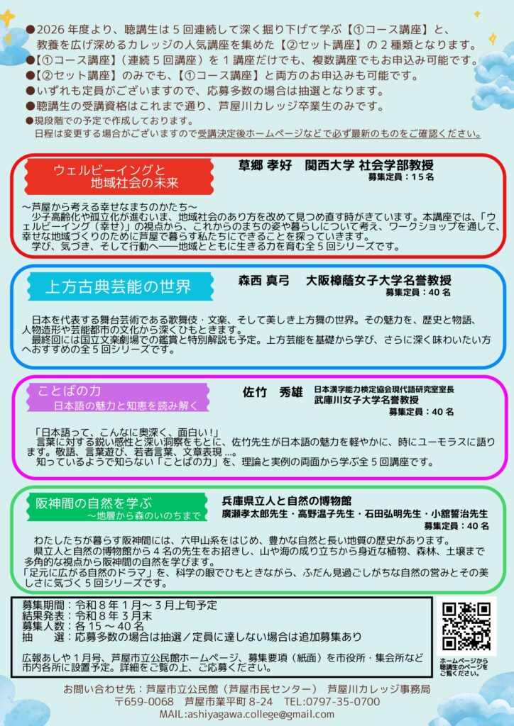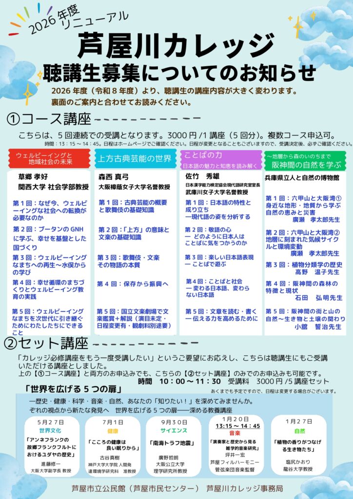 このたび芦屋川カレッジ聴講生では、2026年度(令和8年度)よりカリキュラムをリニューアル致します。生涯学習の理念を大切にしながら、これまで以上に学びを深め、広がりを感じていただけるよう、内容を見直しました。