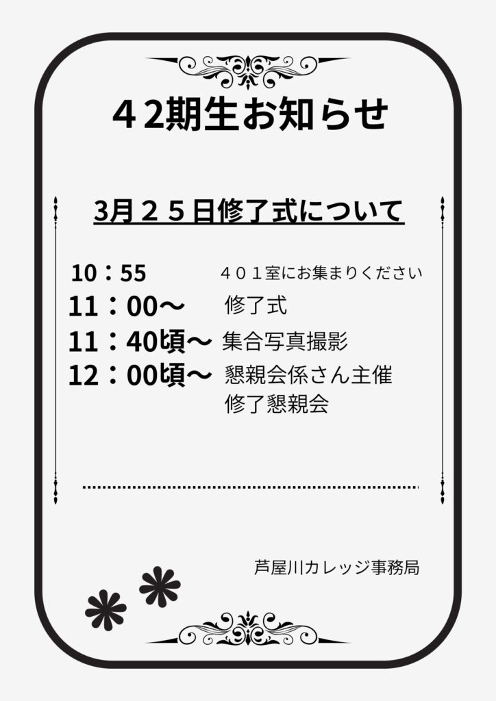 | 卒業後 | カレッジを卒業されますと、大学院や聴講生としての講座を受講していただくことができます。また、卒業生で作る学友会や、同期会として様々な活動にご参加頂けます。 |